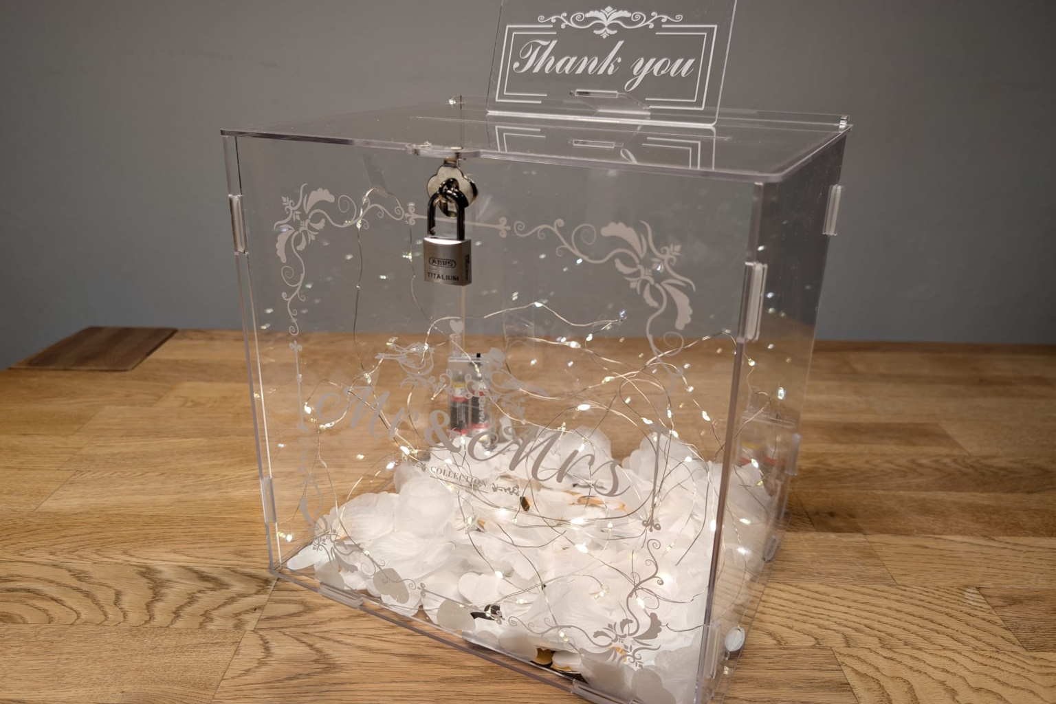 Unsere Acryl-Kartenbox vereint moderne Eleganz und Sicherheit und bietet den perfekten Platz für eure Karten und Geldgeschenke.