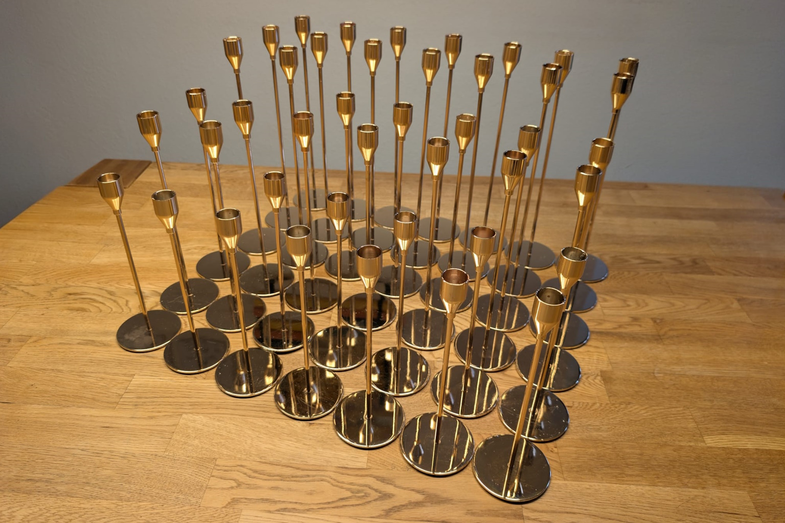 Unsere goldenen Kerzenständer in verschiedenen Höhen – die perfekte Dekoration für elegante und stimmungsvolle Events.