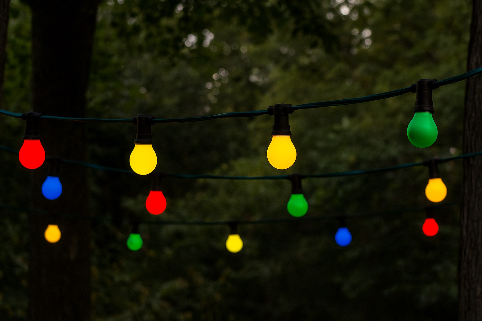 Unsere 7 m wetterfeste Lichterkette mit bunten LED-Birnen – perfekt für stimmungsvolle Außenbeleuchtung auf deiner Feier.